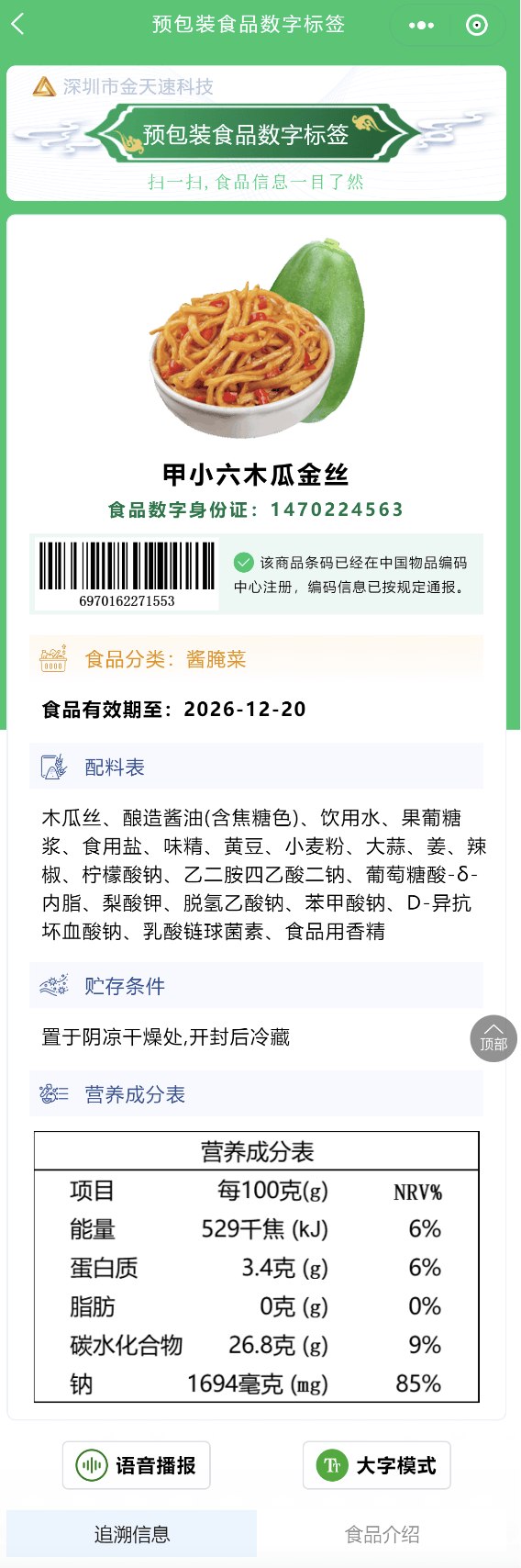 2025年7月,正在这一布景下,深圳市金天速科技无限公司旗下金点防伪溯源平台积极响应政策,食物标签办理正式步入数字化、智能化新阶段。既简化包拆印刷,沉点处理保守标签字体小、消息承载无限、阅读未便等问题。